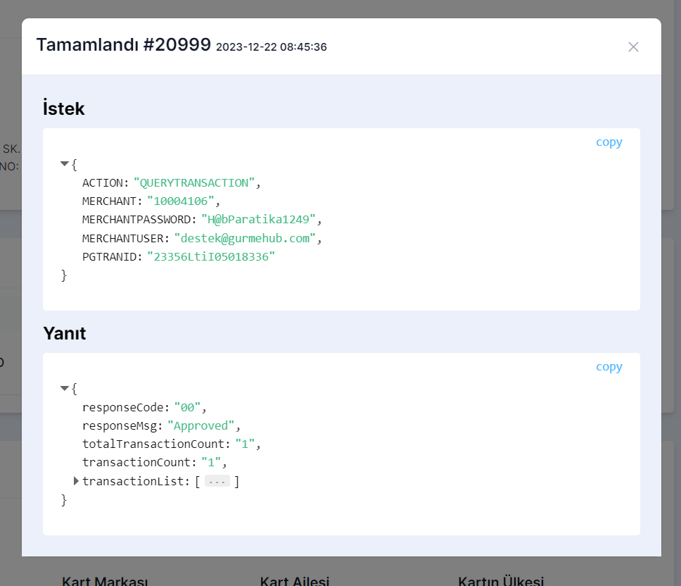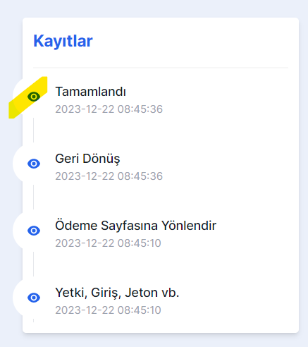 Kayıtlar bloğunda ödeme işlemi sırasında tüm gerçekleşen olaylar detaylı bir şekilde loglanır, bu loglar ile aldığınız hataları bizimle veya ödeme kuruluşunuz ile paylaşabilirsiniz. tek yapmanız gereken oluşan adımın detaylarını görüntüleme butonuna tıklamak.
