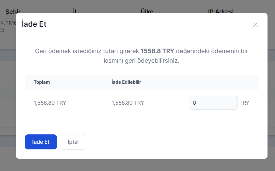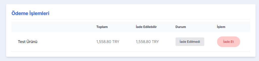 POS Entegratör’ün işlemler sayfası üzerinden gerçekleşen başarılı işlemler için iptal, iade ve parçalı iadeler oluşturabilirsiniz. Oluşturacağınız her iptal iade isteği bir işlem olarak geçer ve başarılı, başarısız durumlarını görüntüleyebilirsiniz.