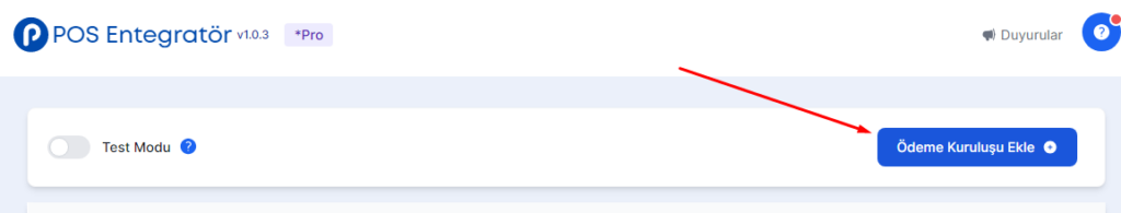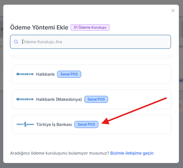 Daha sonra POS Entegratör üzerinden “Ödeme Kuruluşu Ekle” menüsünden İş Bankası ekliyoruz.