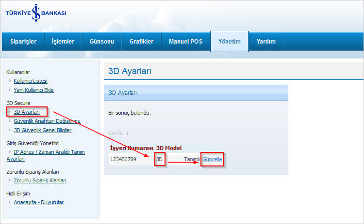 3D Sisteminiz banka tarafından açık veya kapalı olduğunu teyit etmek için sol menüden 3D Ayarları bağlantısına tıklayın.