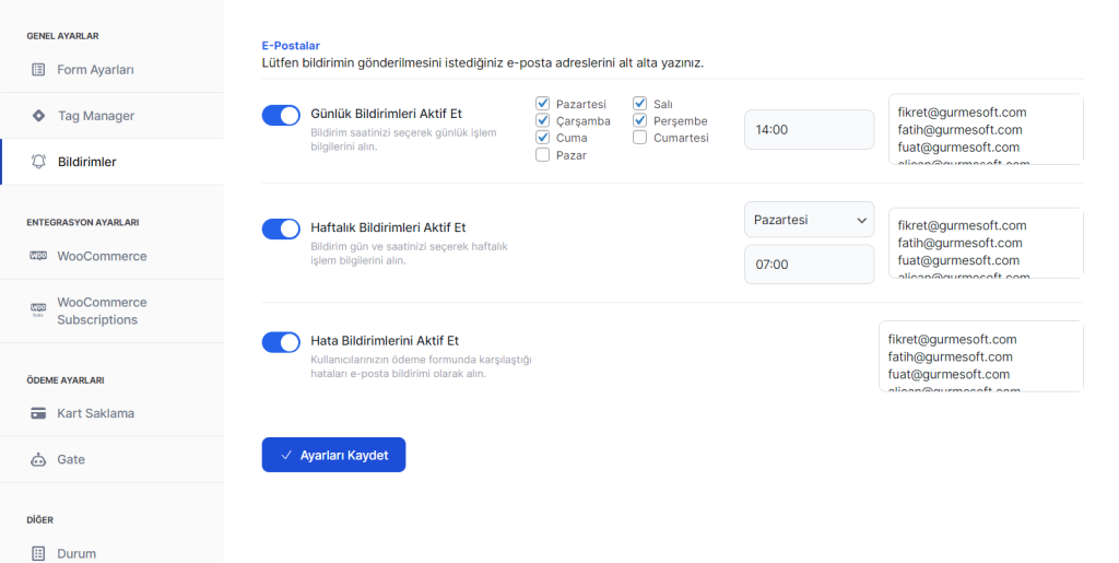 Hatalı işlem bildirimleri, günlük bildirimler ve haftalık bildirimleri almak isteyen kullanıcılar için geliştirdiğimiz Bildirimler özelliği ile ödeme süreçlerinize tam olarak hakim olabilirsiniz. Hata bildirimleri aktif ederek ödeme işleminde her hangi bir hata yaşandığında anlık olarak belirlediğiniz mail adreslerine mail gönderilir. Günlük bildirimleri aktif ederek belirlediğiniz günler ve saatlerde o gün içinde gerçekleşen tüm ödeme işlemlerinden haberdar olabilirsiniz. Yine haftalık bildirimler ile o hafta gerçekleşen tüm işlem raporlarını istediğiniz haftanın bir gününde alabilirsiniz.