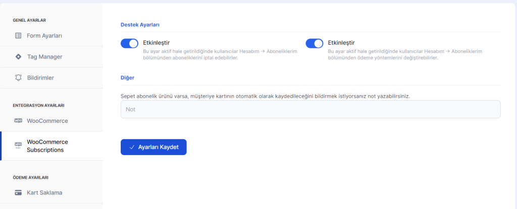 POS Entegratör > Ayarlar > WooCommerce Subscriptions ekranlarından müşterilerinizin abonelik süreçlerini yönetmesine izin verebilirsiniz. Abonelik iptallerini kapatabilir veya aboneliği bağlı kartların değiştirilmesini olanak sağlayabilirsiniz. Aynı zamanda dilerseniz ödeme sırasında kullanıcılara kayıtlarının kayıt edileceğine dair bilgi verebilirsiniz.