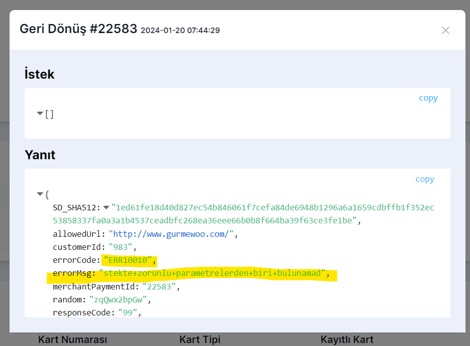 Detayları görmek istediğinizde sizlere sitenizden atılan istek ve geri dönen cevabı görüntüleyebilirsiniz burada işleminiz hakkında tüm detayları görüntüleyebilirsiniz bu sayede ödemenizin neden başarısız olduğunu anlayabilir ve bu bilgiler ile anlaşmalı olduğunuz ödeme kuruluşu veya banka ile iletişime geçebilirsiniz.
