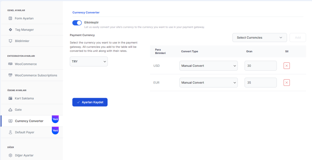 Para birimi çevirici ayarları üzerinden tüm para birimleri için kaç ile çarpılacağını manuel şekilde belirleyebilirsiniz. Örneğin; çıkış para biriminizi TL olarak seçtiniz ve para birimi olarak USD gösteriyorsunuz USD’nin 30 ile çarpılmasını belirterek güncel kur üzerinden TL ile ödeme alabilirsiniz.