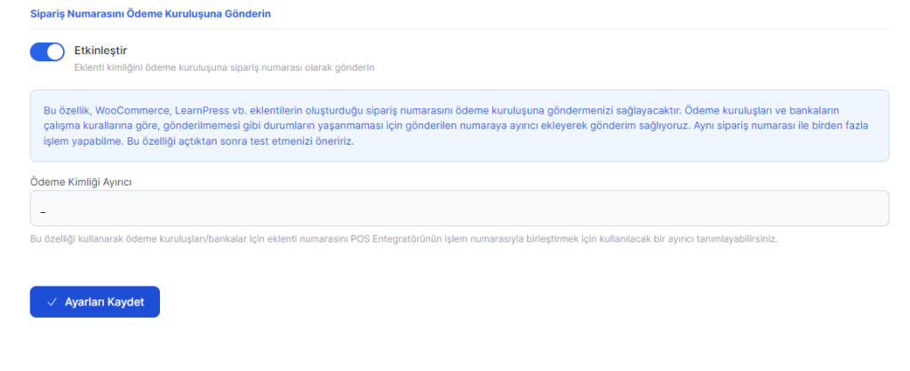 Bu özellik, WooCommerce, LearnPress ve benzeri eklentilerin oluşturduğu sipariş numaralarını ödeme kuruluşuna göndermenizi sağlar. Ödeme kuruluşları ve bankaların çalışma kurallarına göre, gönderilmemesi durumlarında yaşanması muhtemel karışıklıkları önlemek için gönderilen numaraya belirli bir ayrıcı ekleyerek gönderim sağlıyoruz. Aynı sipariş numarası ile birden fazla işlem yapılabilir. Bu özelliği etkinleştirdikten sonra test edilmesi önerilir.